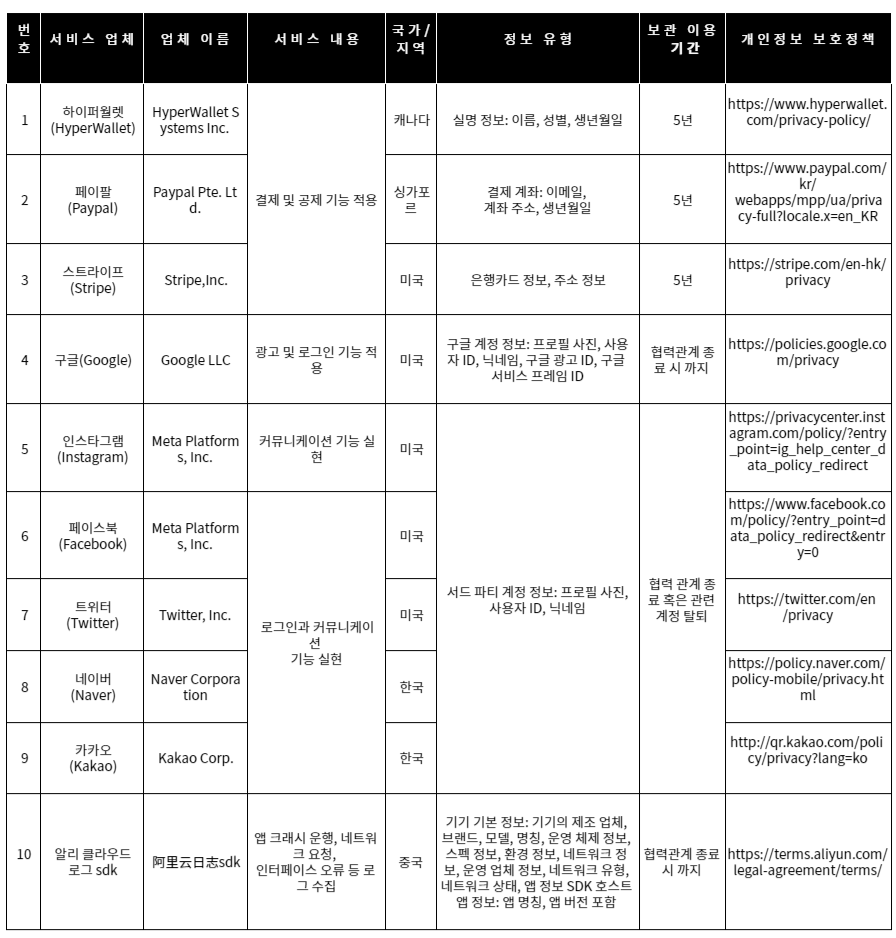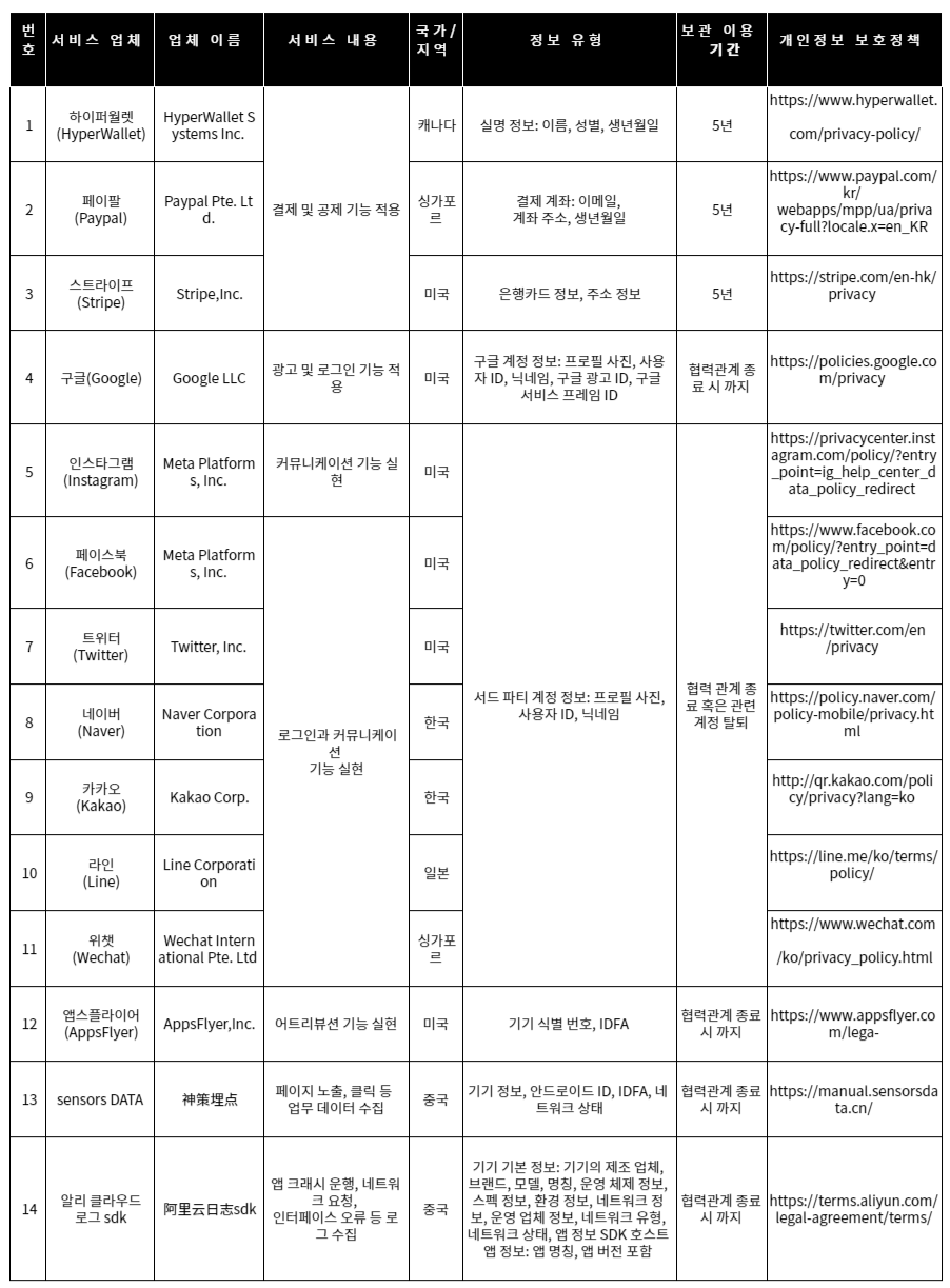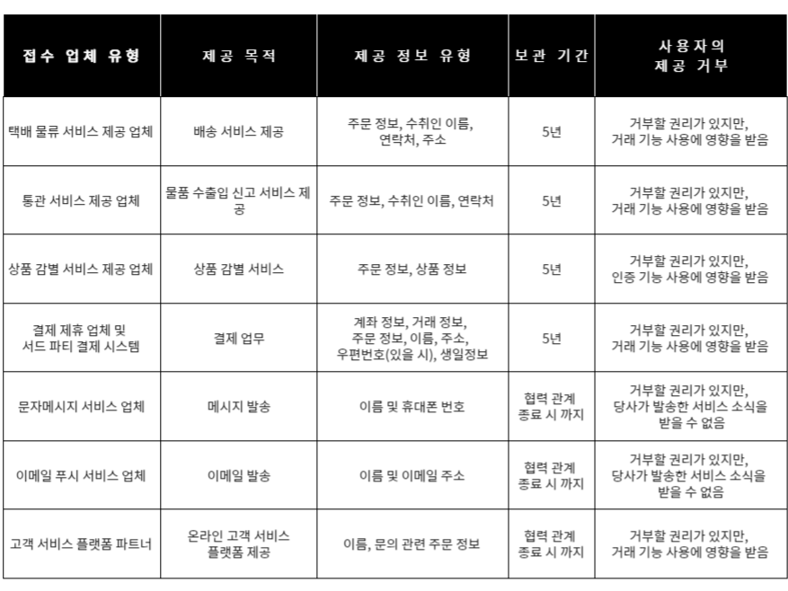 귀하가 당사 입점 마켓의 백그라운드 서비스를 이용할 경우, 당사는 귀하에게 SNS 계정, 상품 기호도, 기업 책임자 명칭 등의 개인 정보 제공을 요청할 수 있습니다. 상기 정보는 스스로 삭제하거나 계정 탈퇴 시 더 이상 보관되지 않습니다.